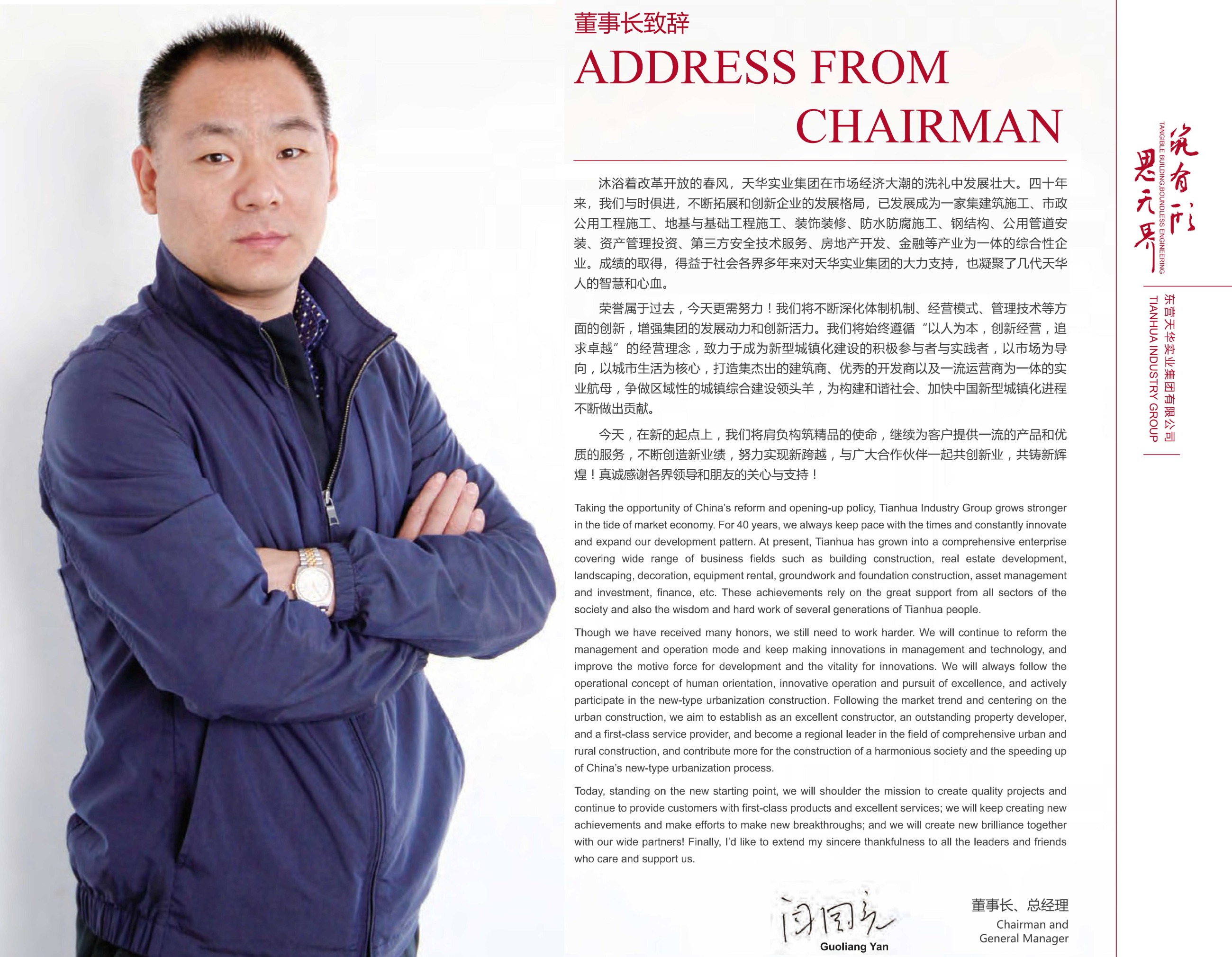 沐浴著改革開放的春風(fēng),天華實(shí)業(yè)集團(tuán)在市場經(jīng)濟(jì)大潮的洗禮中發(fā)展壯大。四十年來,我們與時(shí)俱進(jìn),不斷拓展和創(chuàng)新企業(yè)的發(fā)展格局,已發(fā)展成為一家集建筑施工、市政公用工程施工、地基與基礎(chǔ)工程施工、裝飾裝修、防水防腐施工、鋼結(jié)構(gòu)、公用管道安裝、資產(chǎn)管理投資、第三方安全技術(shù)服務(wù)、房地產(chǎn)開發(fā)、金融等產(chǎn)業(yè)為一體的綜合性企業(yè)。成績的取得,得益于社會各界多年來對天華實(shí)業(yè)集團(tuán)的大力支持,也凝聚了幾代天華人的智慧和心血。榮譽(yù)屬于過去,今天更需努力!我們將不斷深化體制機(jī)制、經(jīng)營模式、管理技術(shù)等方面的創(chuàng)新,增強(qiáng)集團(tuán)的發(fā)展動力和創(chuàng)新活力。我們將始終遵循“以人為本,創(chuàng)新經(jīng)營,追求超越”的經(jīng)營理念,致力于成為新型城鎮(zhèn)化建設(shè)的積極參與者與實(shí)踐者,以市場為導(dǎo)向,以城市生活為核心,打造集杰出的建筑商、良好的開發(fā)商以及優(yōu)良運(yùn)營商為一體的實(shí)業(yè)航母,爭做區(qū)域性的城鎮(zhèn)綜合建設(shè)領(lǐng)頭羊,為構(gòu)建和諧社會、加快中國新型城鎮(zhèn)化進(jìn)程不斷做出貢獻(xiàn)。