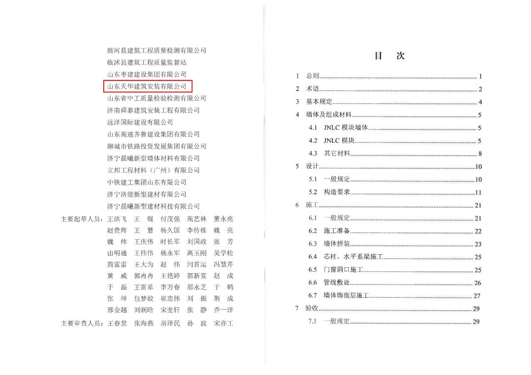 山東標(biāo)準(zhǔn)化協(xié)會印刷發(fā)布了由天華實業(yè)集團參與編制的《JNLC高精度榫接復(fù)合模塊裝配式內(nèi)隔墻體應(yīng)用技術(shù)規(guī)范》(T/SDAS 300—2021)。該標(biāo)準(zhǔn)規(guī)范了JNLC高精度榫接復(fù)合模塊裝配式內(nèi)隔墻體的設(shè)計、施工與驗收,做到技術(shù)先進、安全使用、經(jīng)濟合理和保證工程質(zhì)量。截至目前,天華實業(yè)集團共參與編制了3項省級團體標(biāo)準(zhǔn)。