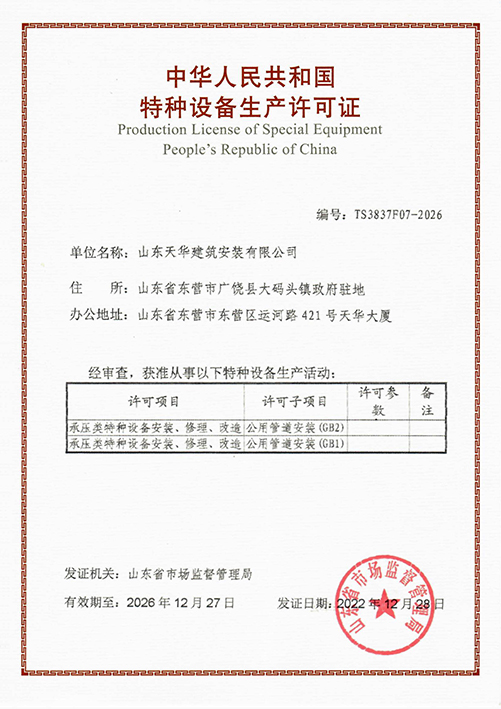 12月28日,從山東省市場監(jiān)督管理局傳來喜訊:天華實(shí)業(yè)集團(tuán)順利通過壓力管道資格認(rèn)證評審工作,獲得山東省市場監(jiān)督管理局頒發(fā)的中華人民共和國特種設(shè)備生產(chǎn)許可證,獲得公用管道安裝GB1、GB2兩項(xiàng)資質(zhì)。
