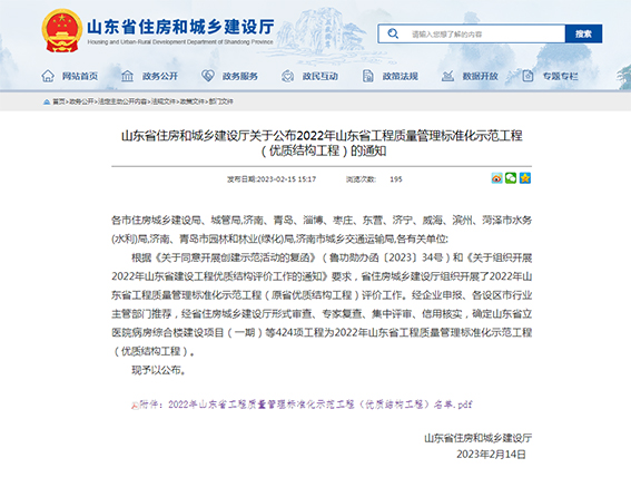 近日,山東省住房和城鄉(xiāng)建設(shè)廳公布2022年山東省工程質(zhì)量管理標(biāo)準(zhǔn)化示范工程(優(yōu)質(zhì)結(jié)構(gòu)工程)獲獎(jiǎng)名單,天華實(shí)業(yè)集團(tuán)所承攬的廣饒魯商城市廣場1#樓及地下車庫項(xiàng)目榜上有名,榮獲2022年度山東省工程質(zhì)量管理標(biāo)準(zhǔn)化示范工程(優(yōu)質(zhì)結(jié)構(gòu)工程)。這是天華實(shí)業(yè)集團(tuán)踐行“創(chuàng)造城市美好生活”的企業(yè)使命,致力打造精品工程的又一成果。