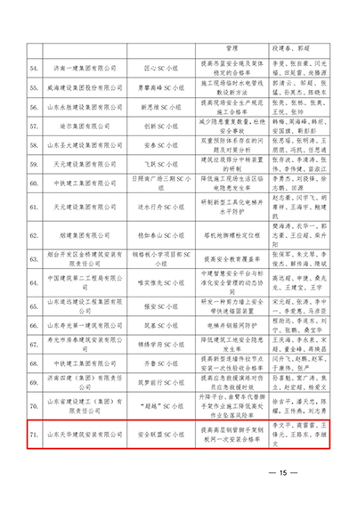 為激發(fā)建筑施工企業(yè)員工開展安全生產(chǎn)科技攻關(guān)和課題研究的積極性、創(chuàng)造性,檢閱群眾性安全管理小組(SC小組)活動(dòng)成果,挖掘基層安全科技創(chuàng)新佳作,山東省建設(shè)工會(huì)、山東省建筑安全與設(shè)備管理協(xié)會(huì)聯(lián)合組織開展了2023年山東省建設(shè)工程安全管理小組(SC小組)優(yōu)秀創(chuàng)新成果競(jìng)賽活動(dòng)。競(jìng)賽評(píng)審包括項(xiàng)目匯報(bào)和專家提問兩個(gè)環(huán)節(jié),最終得出評(píng)審結(jié)果。
