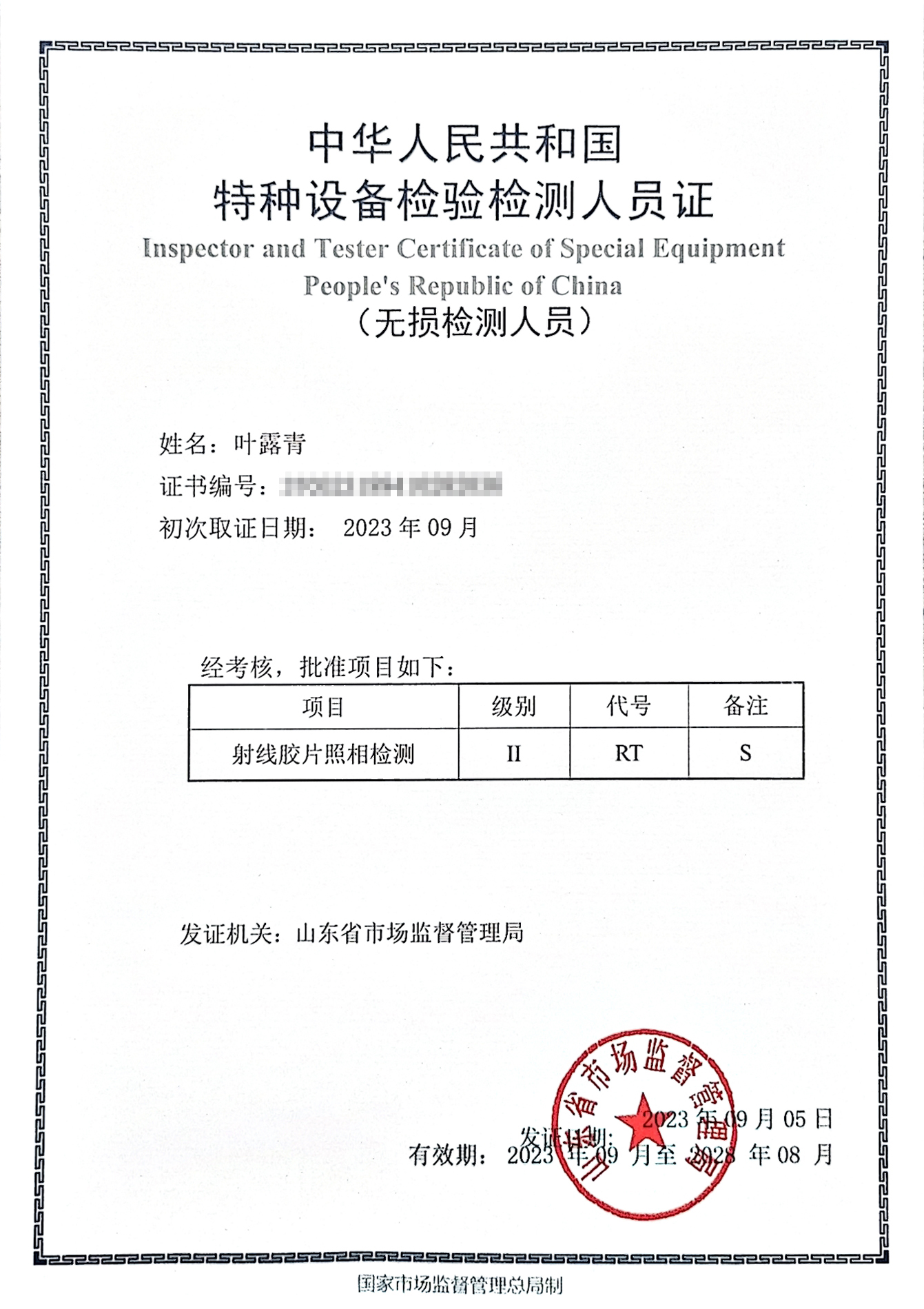 近日,從山東省市場(chǎng)監(jiān)督管理局傳來喜訊:天華實(shí)業(yè)集團(tuán)工程部葉露青順利通過2023年(第8批)特種設(shè)備無(wú)損檢測(cè)RT-I/Ⅱ級(jí)資格取證考試,獲得山東省市場(chǎng)監(jiān)督管理局頒發(fā)的中華人民共和國(guó)特種設(shè)備無(wú)損檢驗(yàn)檢測(cè)資格證,獲得射線膠片照相檢測(cè)RT-Ⅱ級(jí)資質(zhì)。