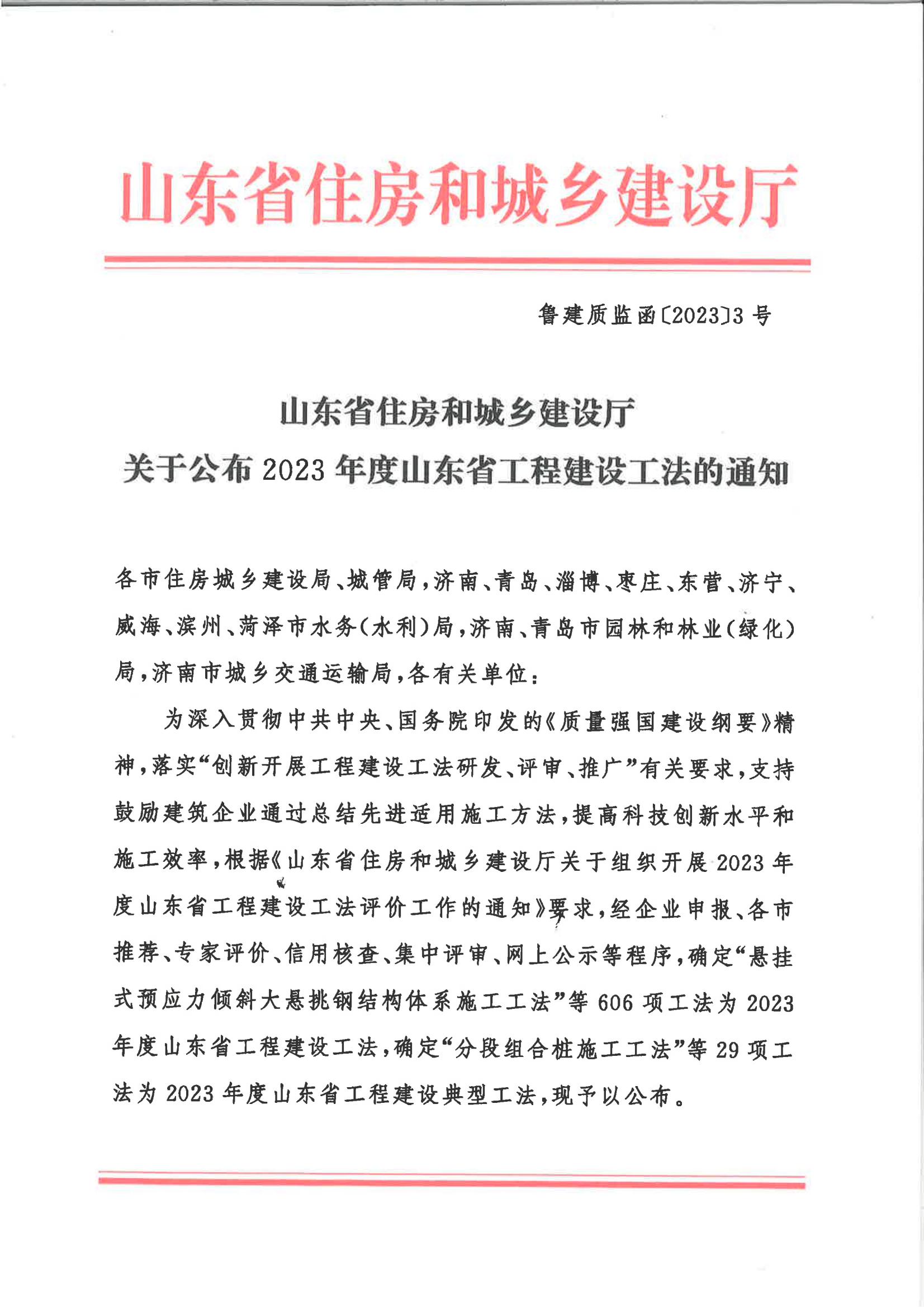 山東省工程建設工法是經(jīng)所在市住房城鄉(xiāng)建設主管部門從當年評選的市級工法中擇優(yōu)推薦的優(yōu)秀工法,旨在鼓勵引導建筑企業(yè)總結(jié)先進施工方法,提高科技水平,保障工程質(zhì)量安全,促進建筑業(yè)持續(xù)健康發(fā)展。
