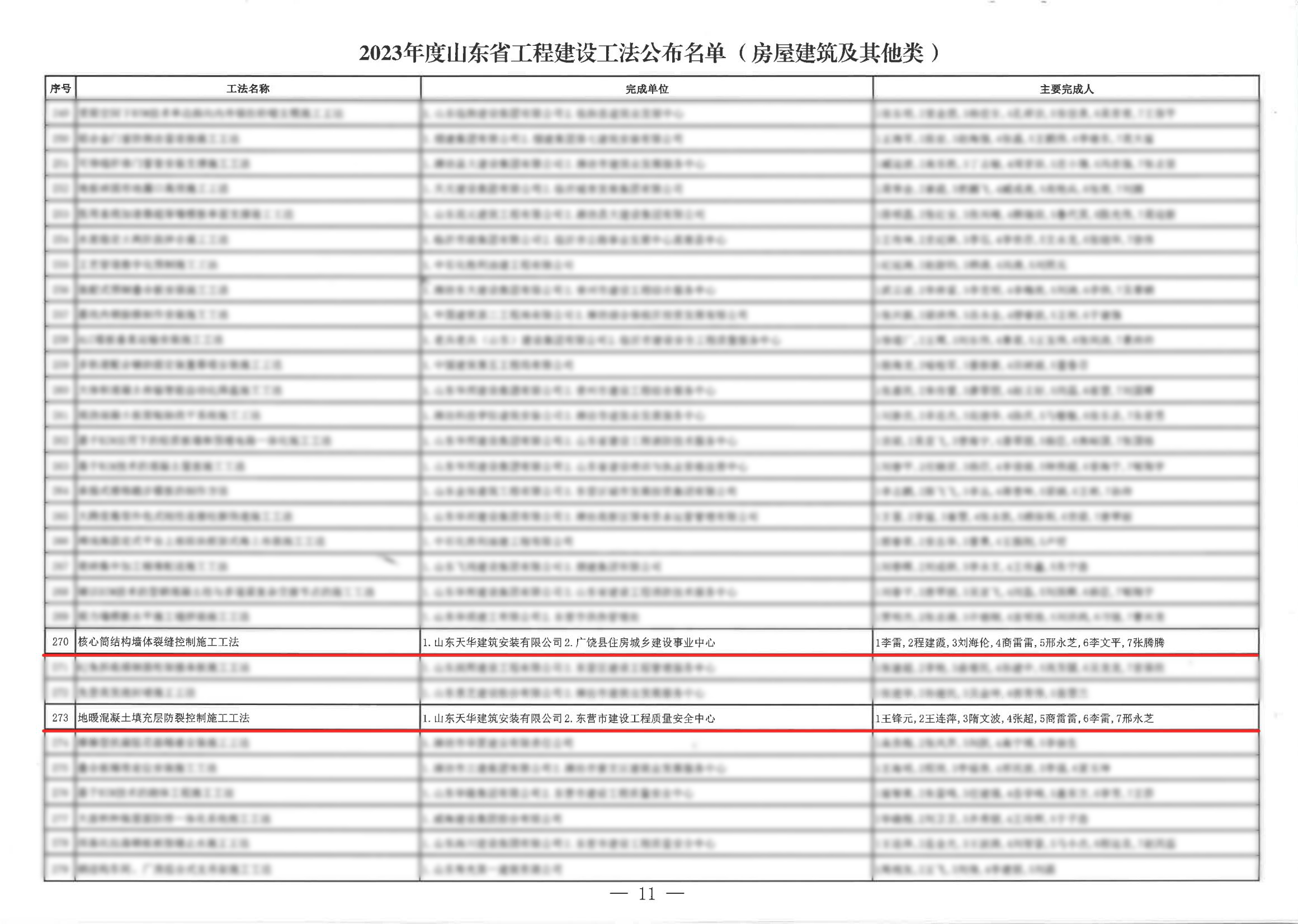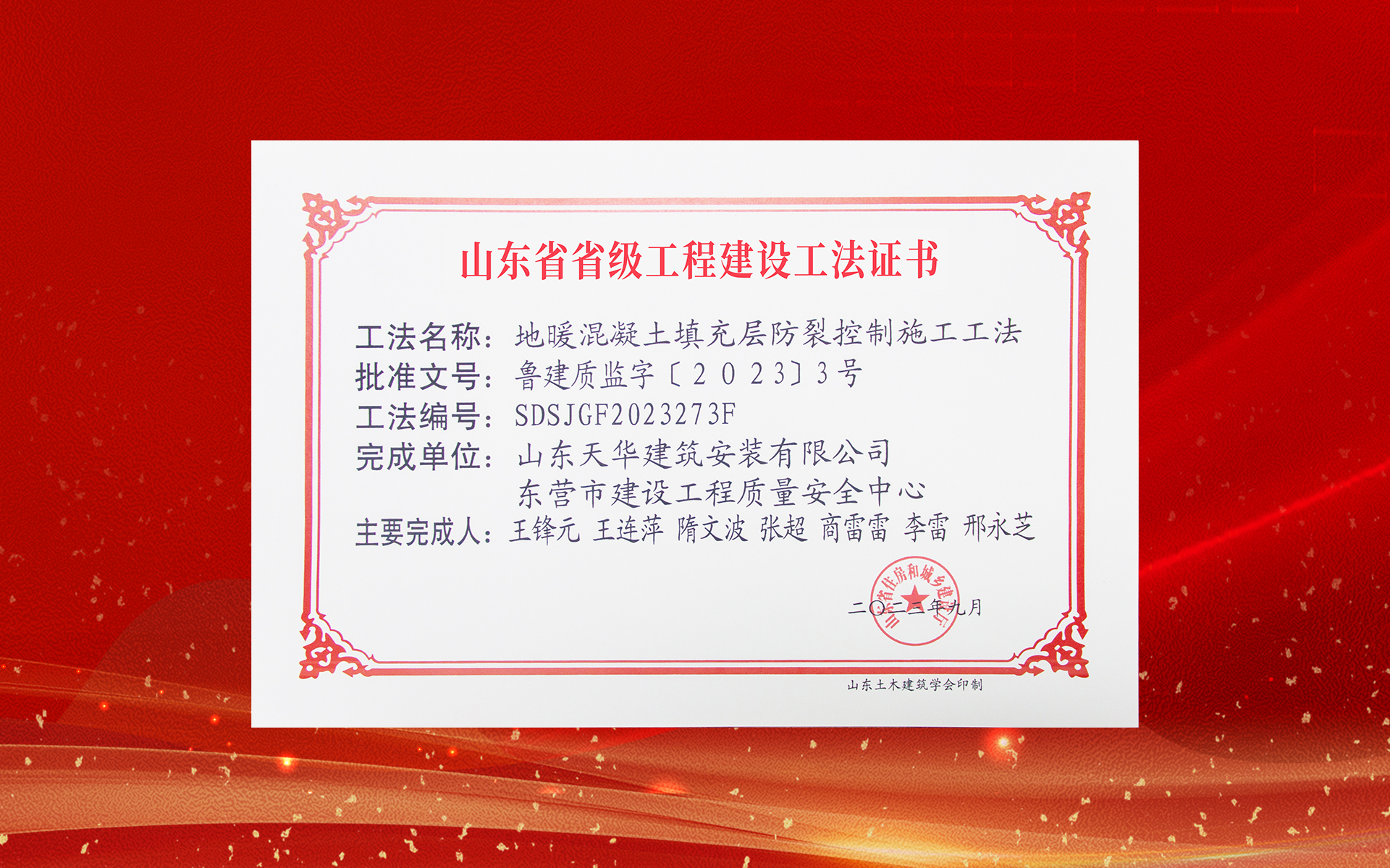近日,山東省住房和城鄉(xiāng)建設廳公布了2023年度山東省工程建設工法名單,天華實業(yè)集團參與申報的《核心簡結(jié)構(gòu)墻體裂縫控制施工工法》、《地暖混凝土填充層防裂控制施工工法》被評定為省級工程建設工法。