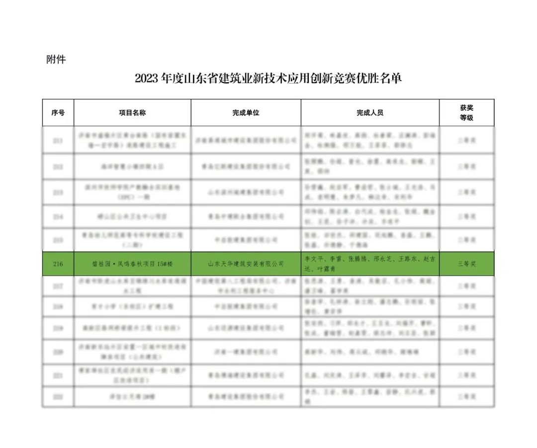 近日,山東省住房和城鄉(xiāng)建設(shè)廳公布了《關(guān)于通報(bào)表?yè)P(yáng)2023年度山東省建筑業(yè)新技術(shù)應(yīng)用創(chuàng)新競(jìng)賽優(yōu)勝名單的通知》。天華實(shí)業(yè)集團(tuán)承建的碧桂園·鳳鳴春秋項(xiàng)目在2023年度山東省建筑業(yè)新技術(shù)應(yīng)用創(chuàng)新競(jìng)賽活動(dòng)中,經(jīng)過(guò)層層篩選,榮獲創(chuàng)新競(jìng)賽三等獎(jiǎng)。