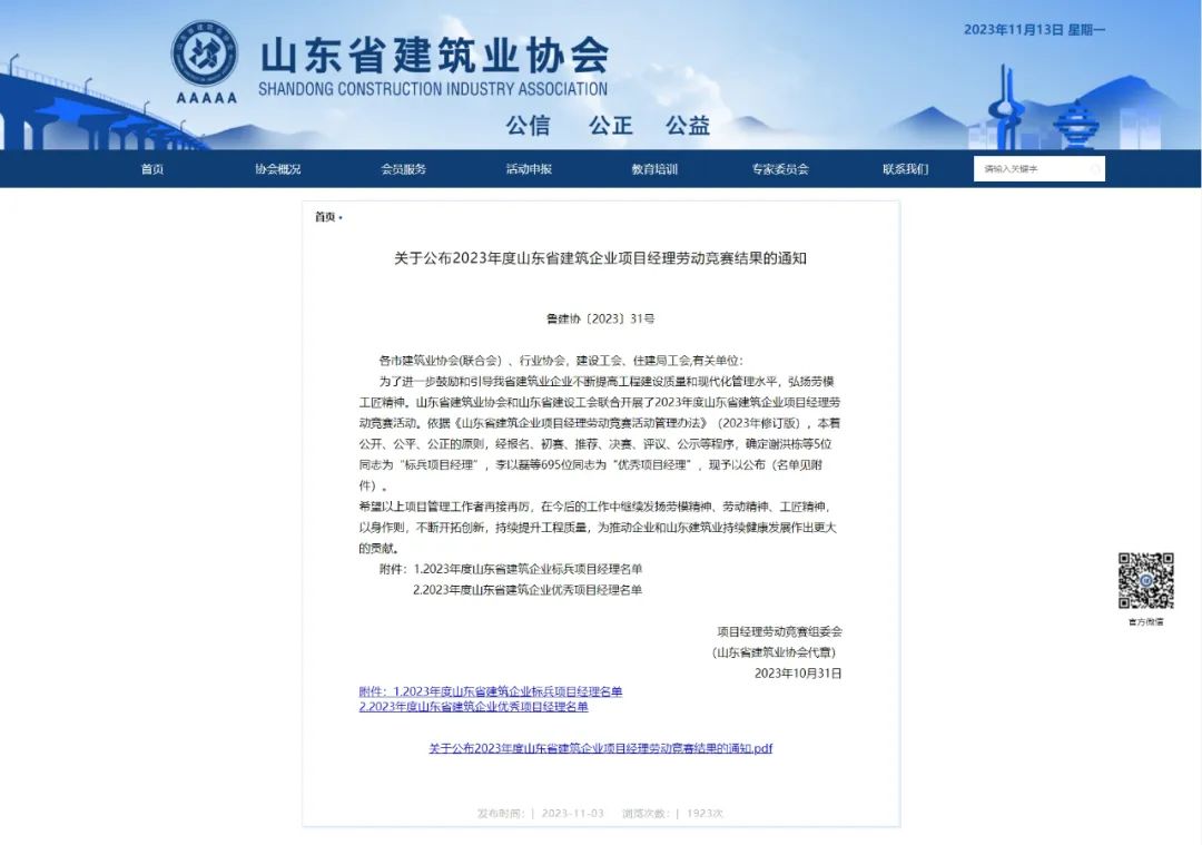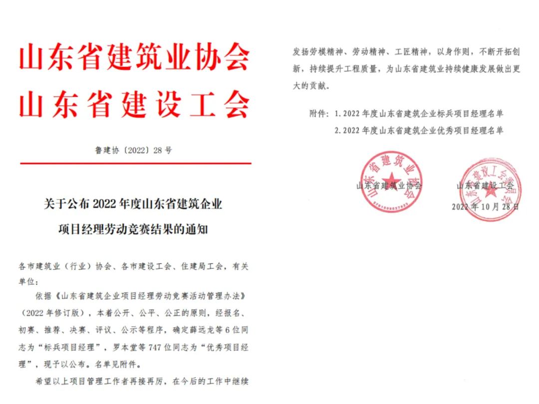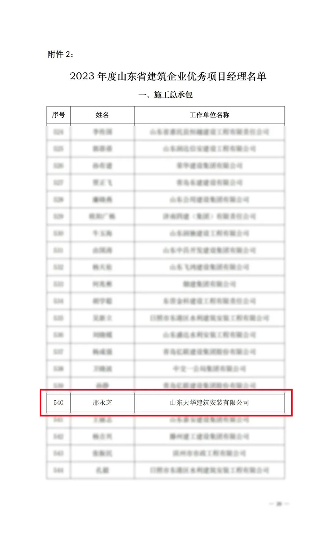 近日,山東省建筑業(yè)協(xié)會(huì)發(fā)布了《關(guān)于公布2023年度山東省建筑企業(yè)項(xiàng)目經(jīng)理勞動(dòng)競(jìng)賽結(jié)果的通知》,天華實(shí)業(yè)集團(tuán)邢永芝獲評(píng)“2023年度山東省建筑企業(yè)優(yōu)秀項(xiàng)目經(jīng)理”。