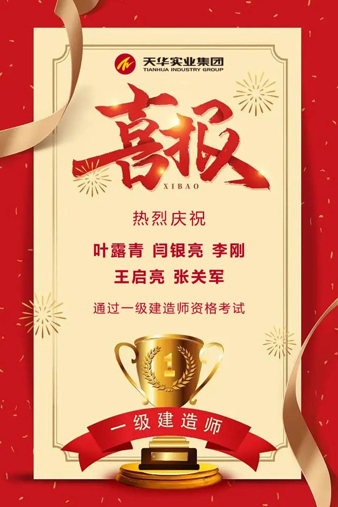 近日,中國人事考試網(wǎng)公布了2023年度全國一級建造師資格考試成績,天華實業(yè)集團工程部葉露青,結(jié)算部閆銀亮,財務部李剛,六分公司德州臨邑金辰雲(yún)境項目部王啟亮、碧桂園?天宸項目部張關(guān)軍等五名員工順利通過考試,體現(xiàn)了天華員工在工作中積極進取、提升自我,不斷提高崗位技能的專業(yè)精神,也為公司高質(zhì)量發(fā)展再添新動力。