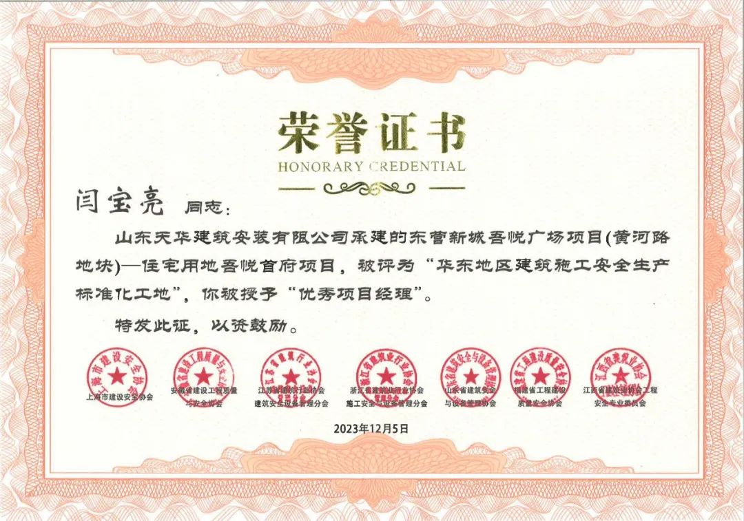 近日,山東省建筑安全與設(shè)備管理協(xié)會(huì)傳來喜訊,由天華實(shí)業(yè)集團(tuán)承建的吾悅首府項(xiàng)目被評(píng)為“華東地區(qū)建筑施工安全生產(chǎn)標(biāo)準(zhǔn)化工地”,同時(shí)授予項(xiàng)目負(fù)責(zé)人閆寶亮“優(yōu)秀項(xiàng)目經(jīng)理”稱號(hào)。