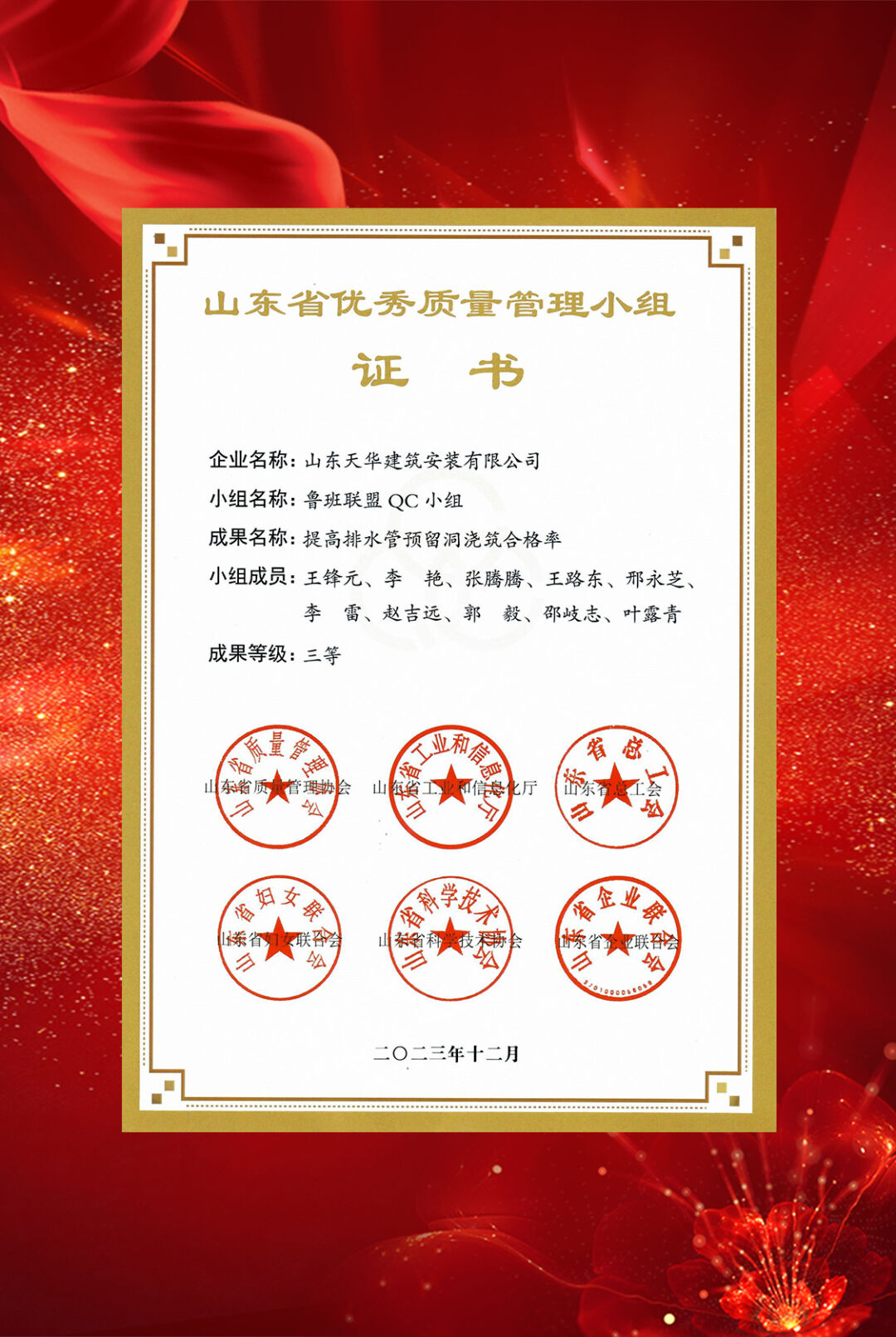 近日,從山東省質(zhì)量管理協(xié)會(huì)傳來喜訊,天華實(shí)業(yè)集團(tuán)魯班聯(lián)盟QC小組的成果《提高排水管預(yù)留洞澆筑合格率》榮獲三等獎(jiǎng),被授予“山東省優(yōu)秀質(zhì)量管理小組”稱號(hào),展現(xiàn)了其在質(zhì)量管理領(lǐng)域的強(qiáng)大實(shí)力和創(chuàng)新能力。