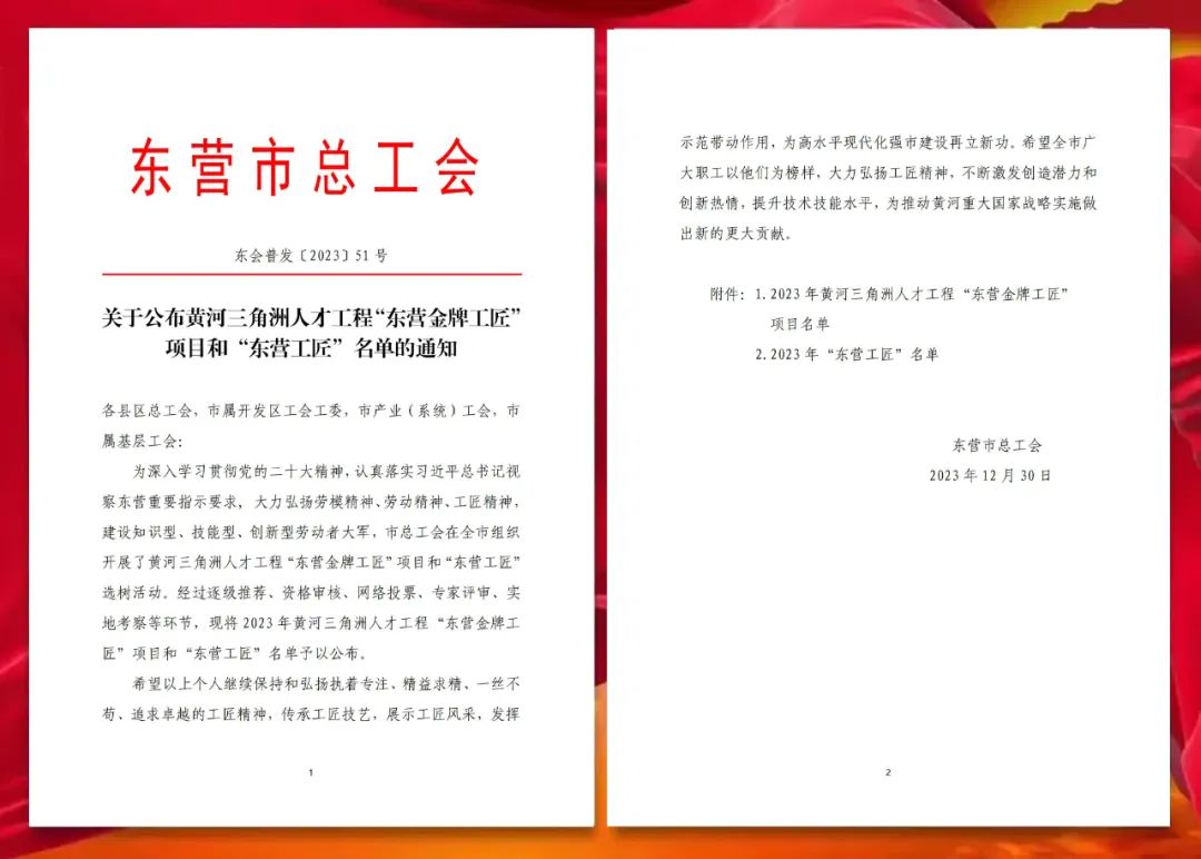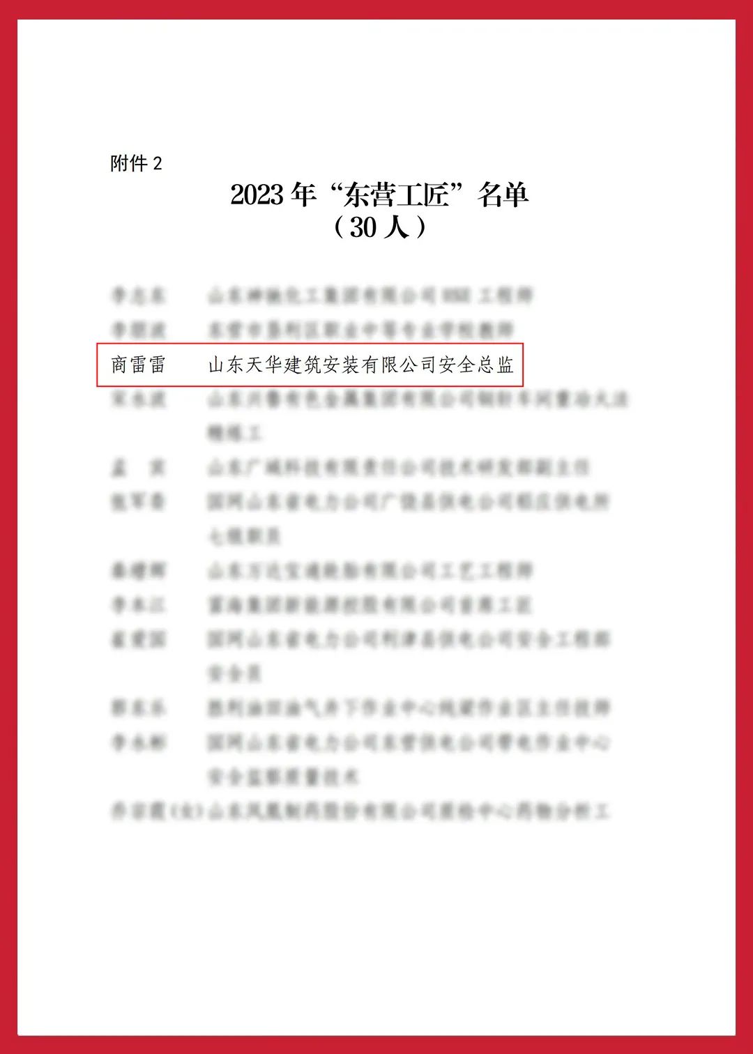 近日,東營(yíng)市總工會(huì)公布了2023年黃河三角洲人才工程“東營(yíng)工匠”名單,經(jīng)過逐級(jí)推薦、資格審核、網(wǎng)絡(luò)投票、專家評(píng)審等環(huán)節(jié),天華實(shí)業(yè)集團(tuán)安全總監(jiān)商雷雷被授予2023年“東營(yíng)工匠”榮譽(yù)稱號(hào)。此項(xiàng)殊榮的獲得,充分展現(xiàn)了新時(shí)代天華實(shí)業(yè)集團(tuán)員工立足本職、崗位建功、爭(zhēng)做標(biāo)兵的昂揚(yáng)斗志和努力拼搏、奮發(fā)有為的精神面貌。