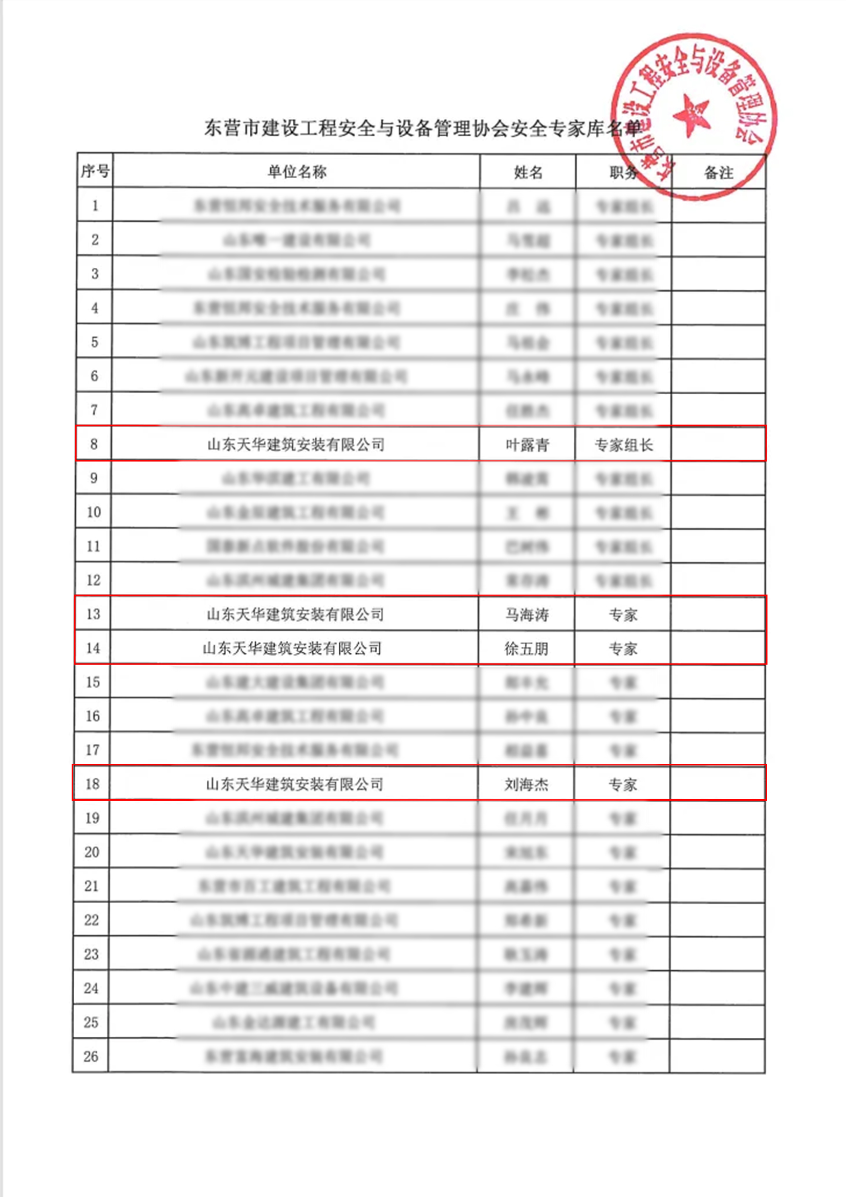為提高市建筑工程安全管理水平,充分發(fā)揮專家隊(duì)伍技術(shù)支撐作用,全力保障市建筑工程安全生產(chǎn)平穩(wěn)運(yùn)行,近日,東營市建設(shè)工程安全與設(shè)備管理協(xié)會(huì)建立安全專家?guī)?。?jīng)各協(xié)會(huì)會(huì)員單位推薦、資料初審、專家評審,天華實(shí)業(yè)集團(tuán)四人入選首批安全專家?guī)?,其?/span>葉露青榮任專家組長,馬海濤、劉海杰、徐五朋等三人被評為安全專家。