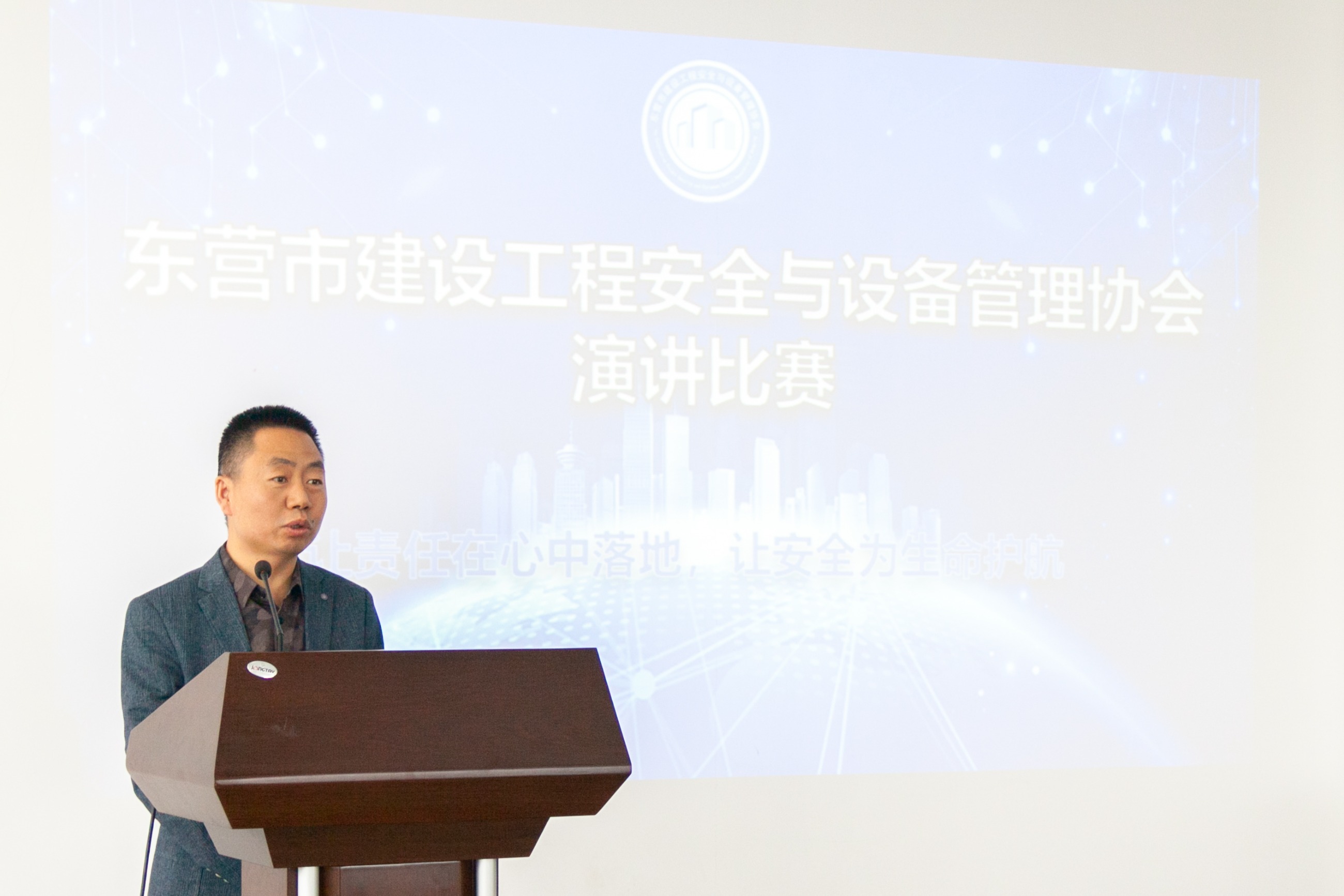 本次演講比賽特別邀請了協(xié)會各負責(zé)人單位領(lǐng)導(dǎo)組成裁判組,東營市建設(shè)工程安全與設(shè)備管理協(xié)會會長、山東天華建筑安裝有限公司安全總監(jiān)商雷雷上臺致辭。