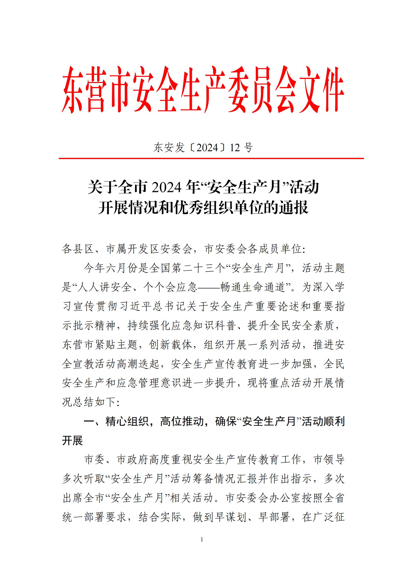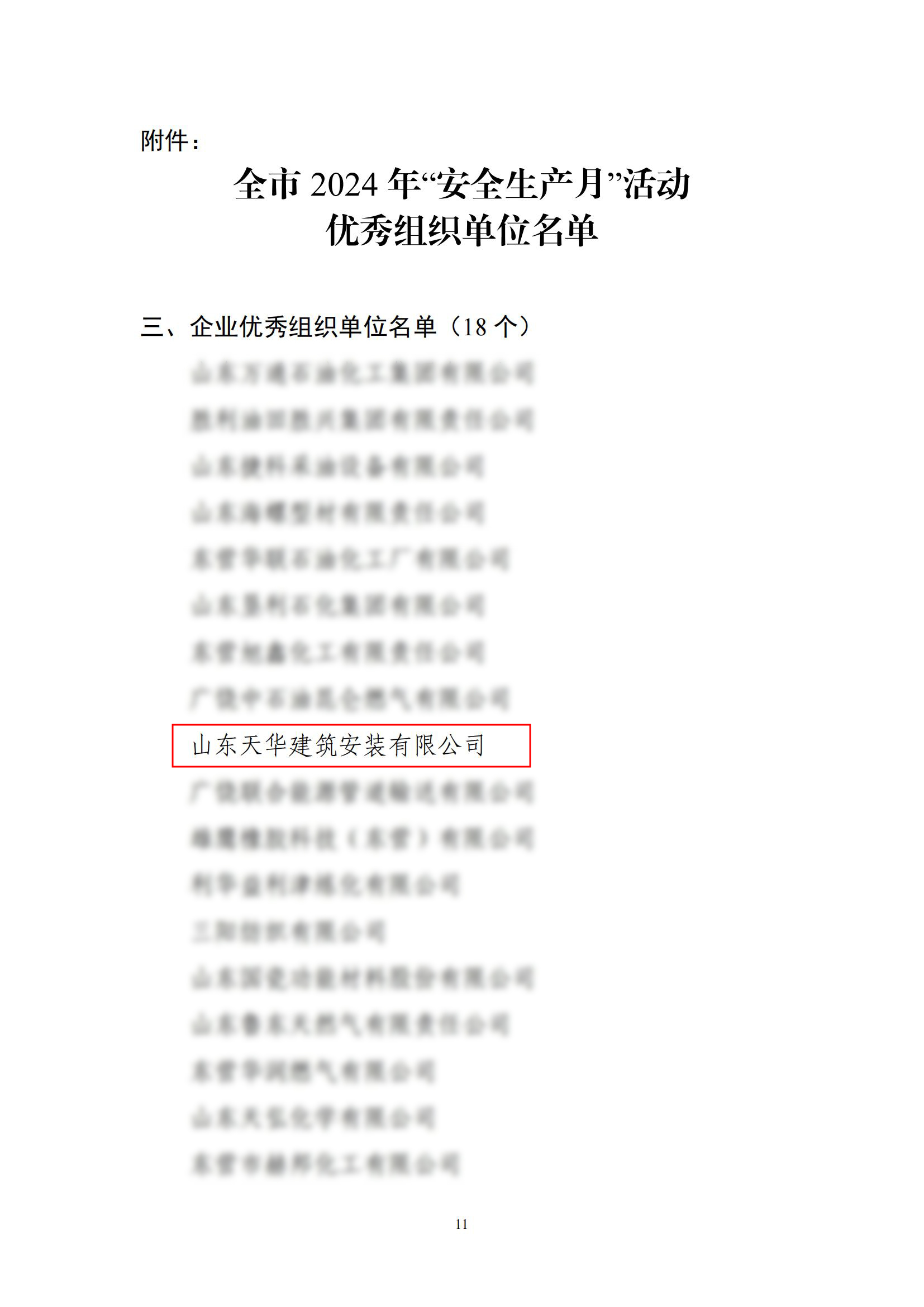 近日,東營市安全生產(chǎn)委員會下發(fā)《關(guān)于全市 2024 年“安全生產(chǎn)月”活動開展情況和優(yōu)秀組織單位的通報》,天華實業(yè)集團(tuán)獲評東營市2024年“安全生產(chǎn)月”活動企業(yè)優(yōu)秀組織單位。