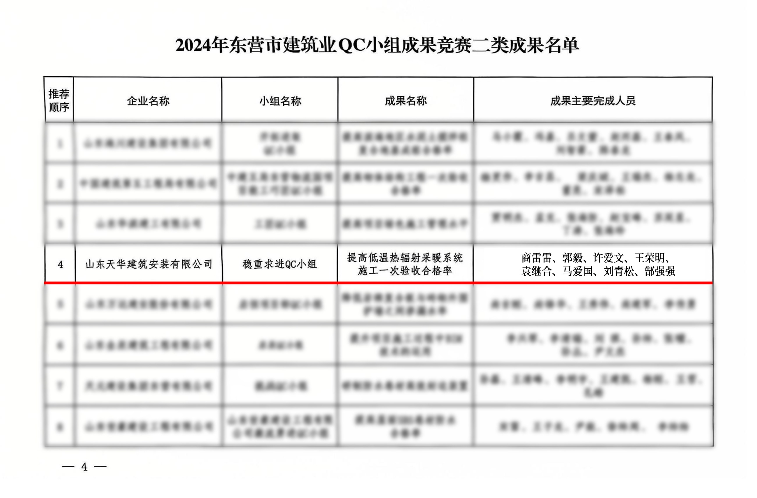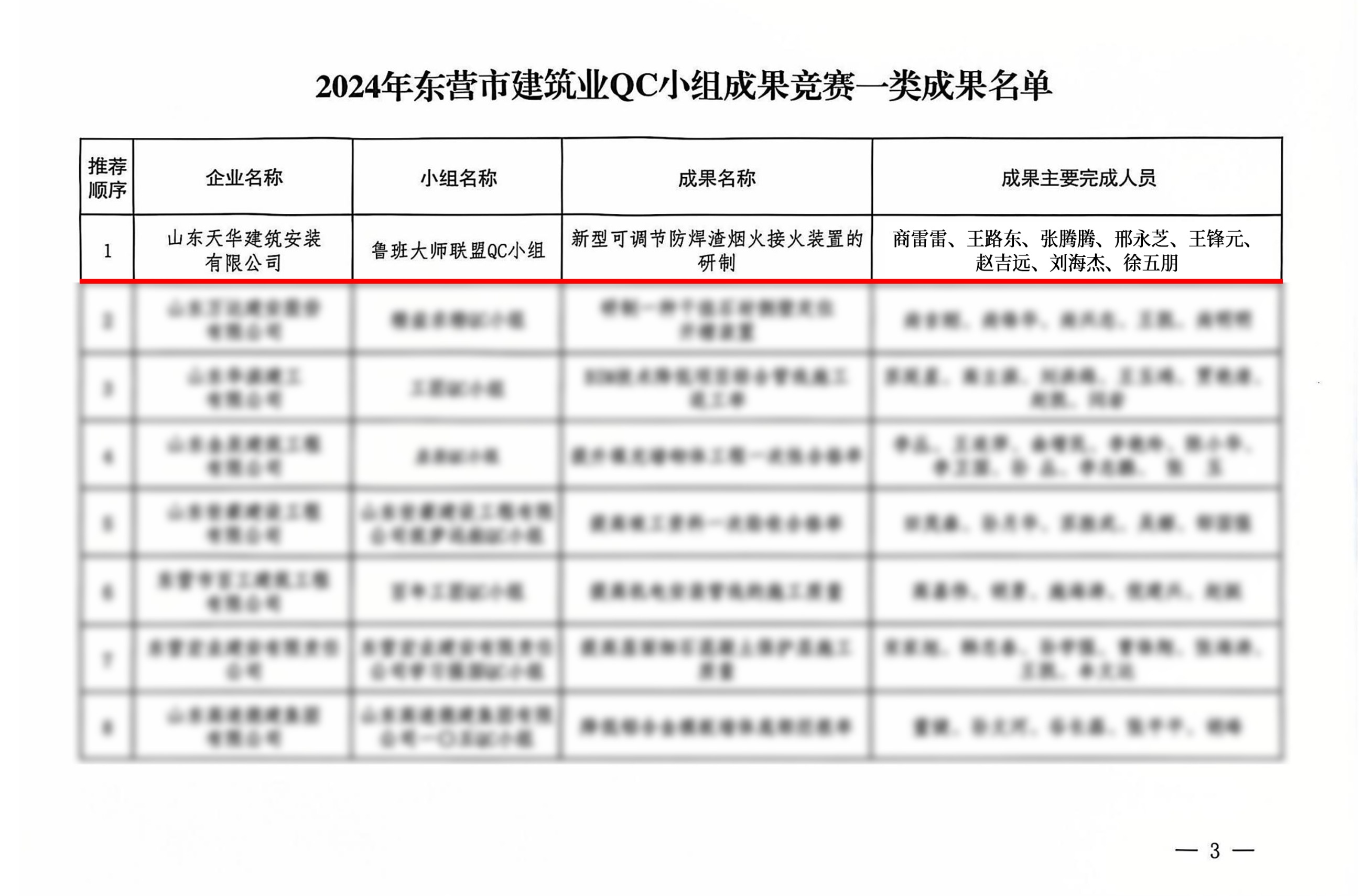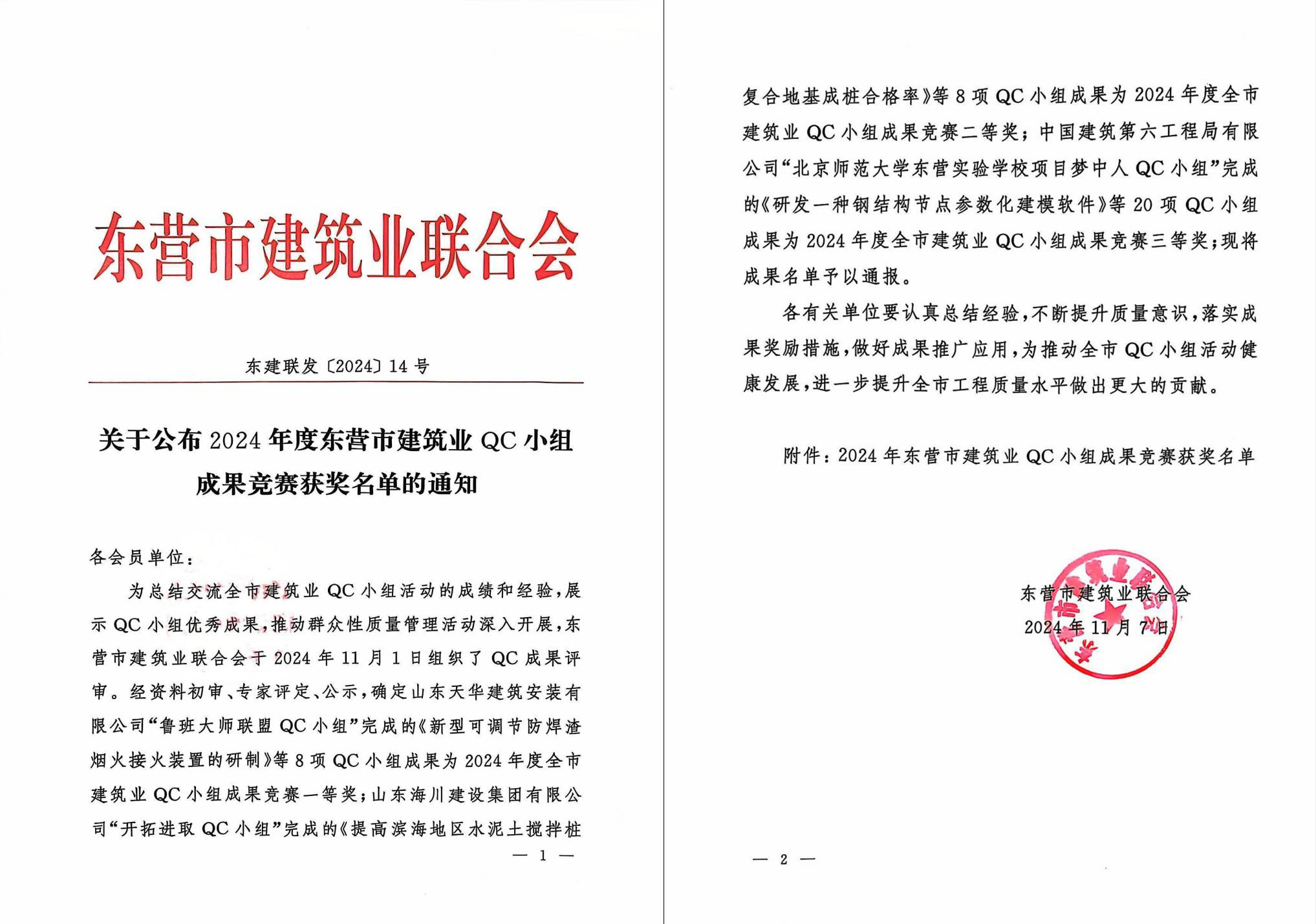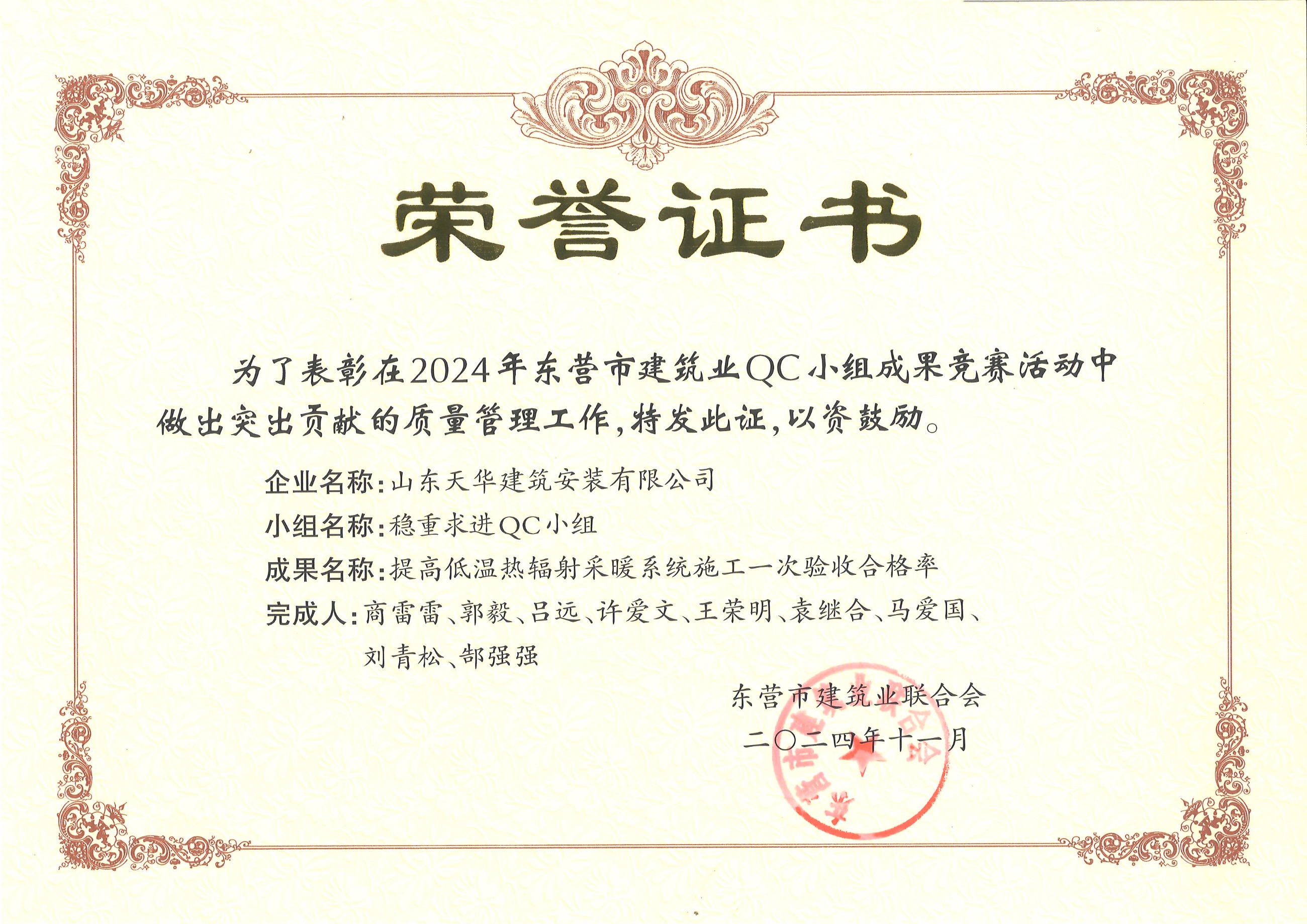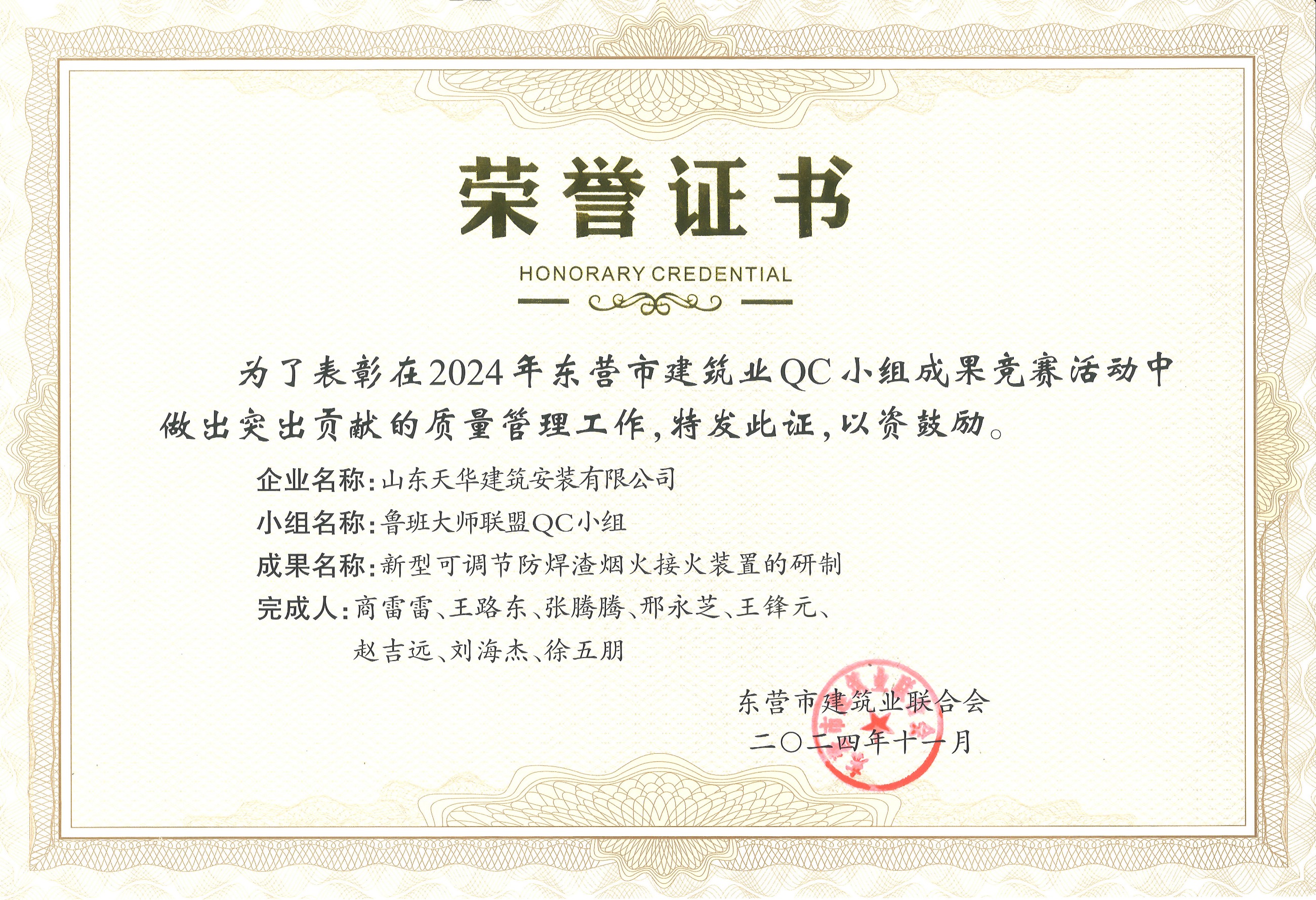 近日,東營(yíng)市建筑業(yè)聯(lián)合會(huì)印發(fā)《關(guān)于公布2024年度東營(yíng)市建筑業(yè)QC小組成果競(jìng)賽獲獎(jiǎng)成果的通知》,天華實(shí)業(yè)集團(tuán)QC小組完成的“新型可調(diào)節(jié)防焊渣煙火接火裝置的研制”“提高低溫?zé)彷椛洳膳到y(tǒng)施工一次驗(yàn)收合格率”兩項(xiàng)成果分別榮獲競(jìng)賽一、二等獎(jiǎng)。