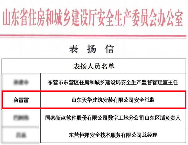 近日,天華實(shí)業(yè)集團(tuán)收到來(lái)自山東省住房和城鄉(xiāng)建設(shè)廳的表?yè)P(yáng)信,對(duì)參與編制《房屋市政工程重大事故隱患執(zhí)法檢查重點(diǎn)事項(xiàng)清單》《房屋市政工程施工企業(yè)重大事故隱患重點(diǎn)排查清單》(簡(jiǎn)稱(chēng)“兩個(gè)清單”)工作的安全總監(jiān)商雷雷的職業(yè)素養(yǎng)與業(yè)務(wù)能力給予了高度評(píng)價(jià)和衷心感謝。