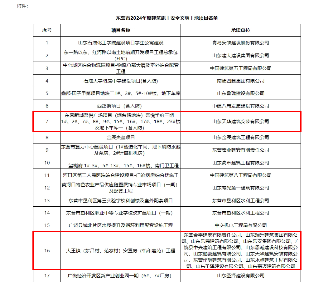 近日,東營市2024年度建筑施工安全文明工地評選結(jié)果揭曉,天華實業(yè)集團(tuán)承建的東營新城吾悅學(xué)府項目、大王怡和嘉苑項目憑借卓越的工程質(zhì)量、施工安全及文明施工表現(xiàn),成功榮獲“安全文明工地”稱號。充分彰顯了企業(yè)品質(zhì)建設(shè)、匠心筑造的實力擔(dān)當(dāng)。