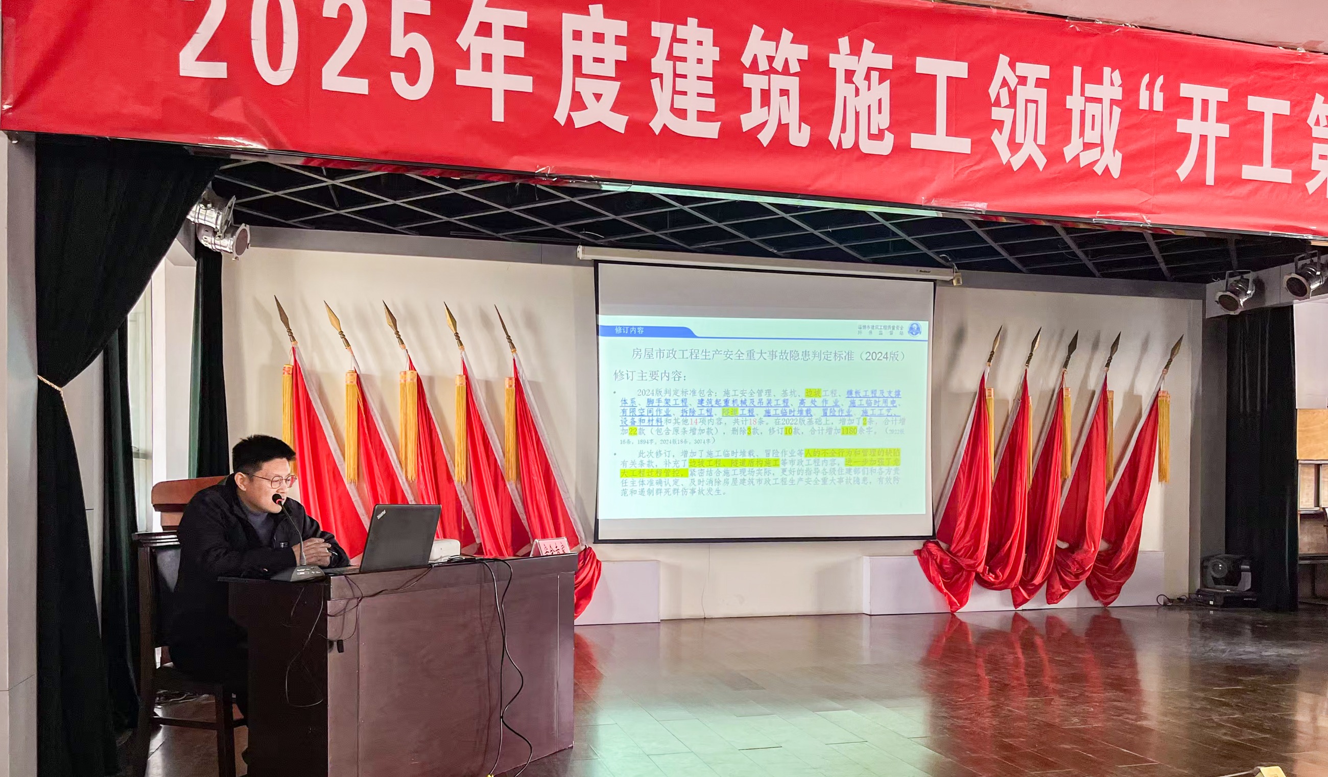 在集中觀看安全警示教育片后,天華實業(yè)集團工程部安全科副科長趙吉遠作“開工第一課”培訓,結(jié)合《房屋市政工程生產(chǎn)安全重大事故隱患判定標準(2024版)》中關(guān)于安全履職相關(guān)法律條文等內(nèi)容,分別從安全理念、現(xiàn)場實操等角度闡述分析,為下一步如何抓好施工現(xiàn)場安全生產(chǎn)管理提供了重要指導和系統(tǒng)參照,使參訓人員充分認識開展好安全生產(chǎn)“開工第一課”的重要性。