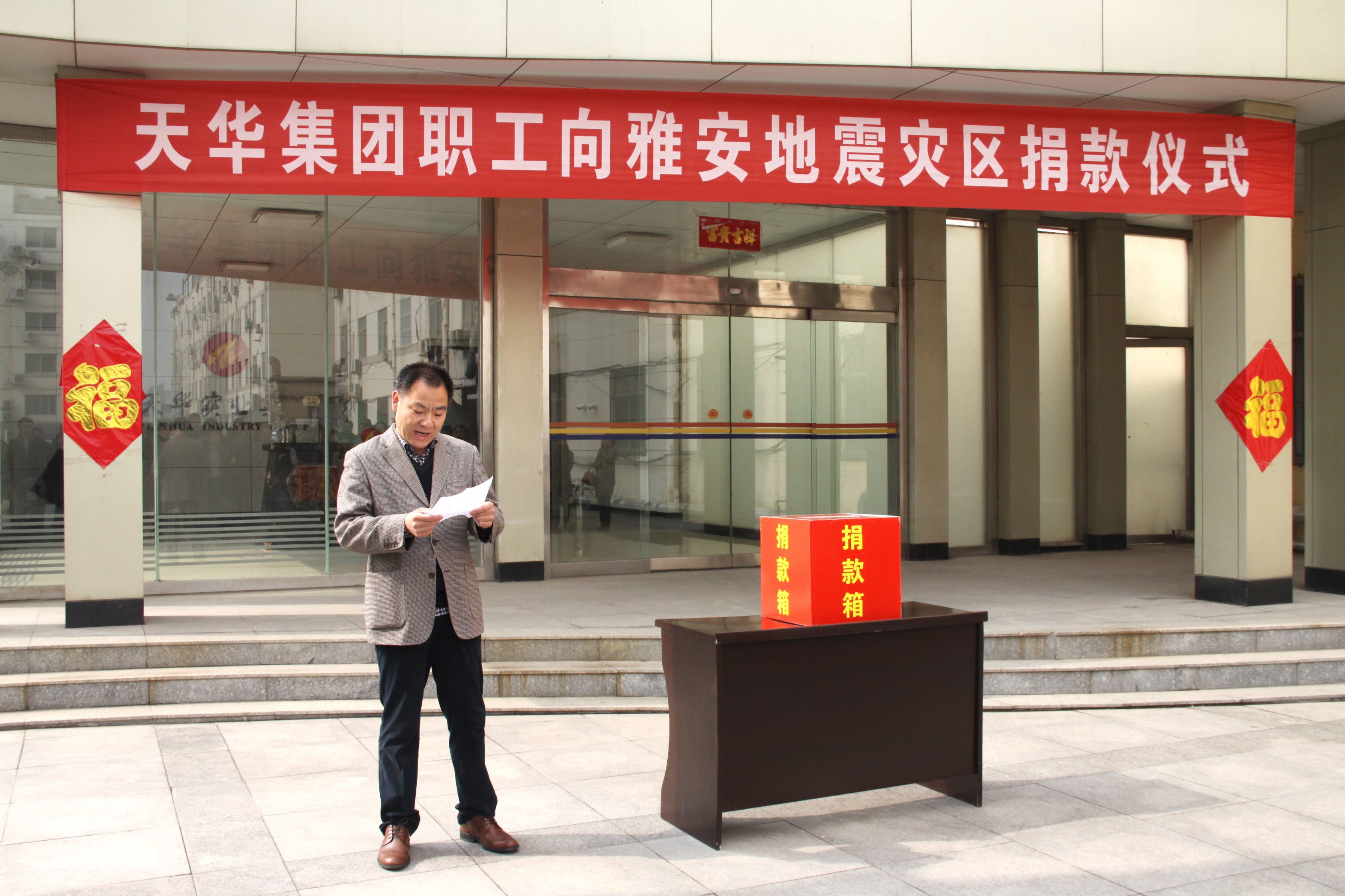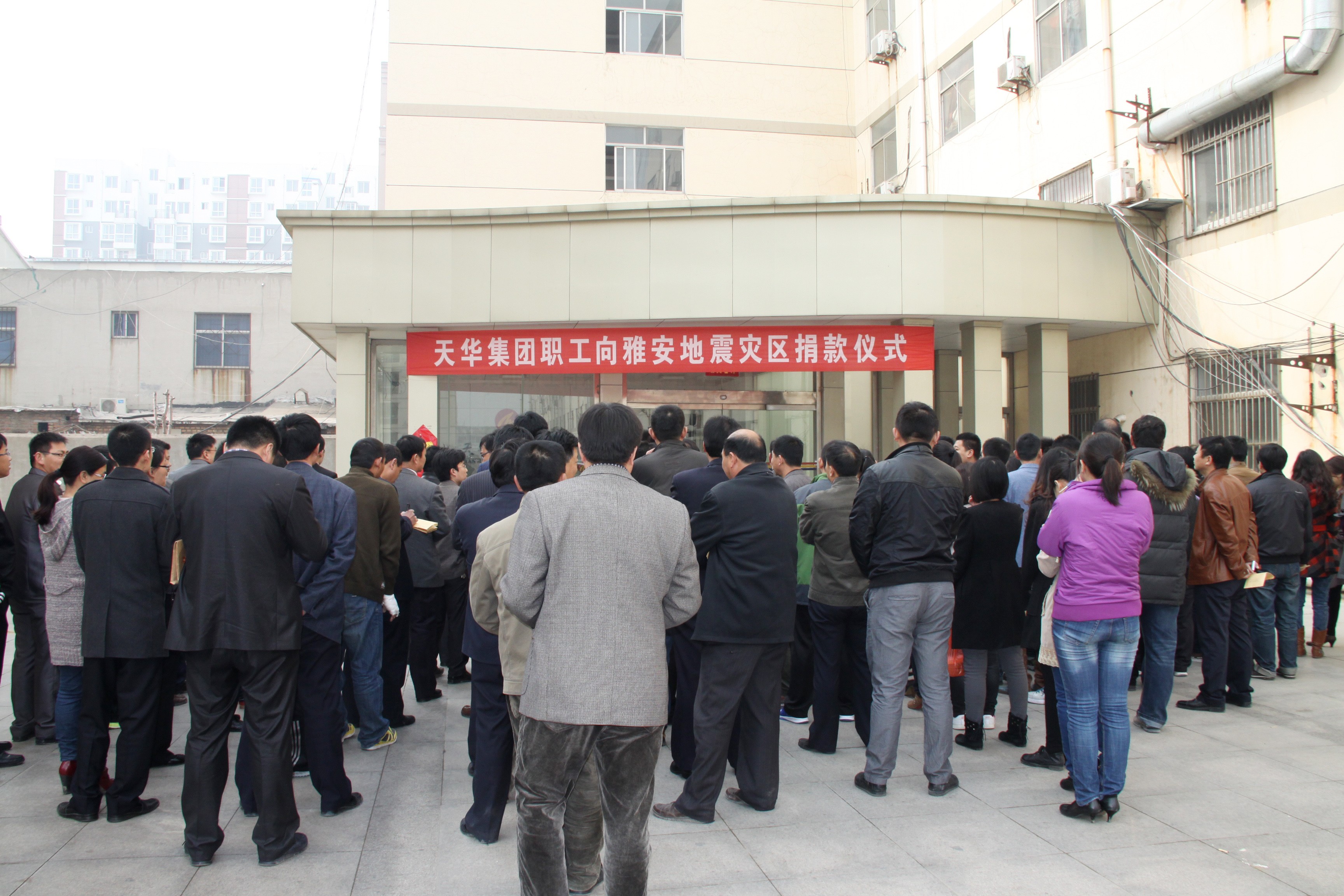 4月20日,四川雅安發(fā)生了7級地震,造成了重大的人員傷亡和財產(chǎn)損失。地震無情人有情,天華集團于4月22日在集團公司院內(nèi)召集全員舉行捐款儀式,董事長閆國亮發(fā)表捐款動員講話,他倡議要繼續(xù)發(fā)揚“一方有難、八方支援,患難相恤、守望相輔”的中華民族傳統(tǒng)美德,指出“企業(yè)和每一個人都是社會細胞的組成部分,應該承擔應有的社會責任”,鼓勵大家用實際行動彰顯博愛情懷,支援雅安災區(qū)人民。
